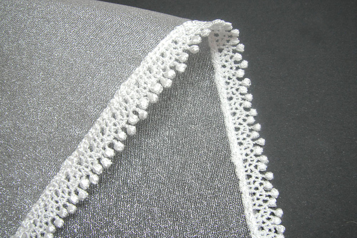 A decorative edge is easy to make using narrow lace. Simply lap the lace ½” from the edge, stitch with a narrow zig zag, then trim the extra organza from under the lace, clipping right up to the stitching.