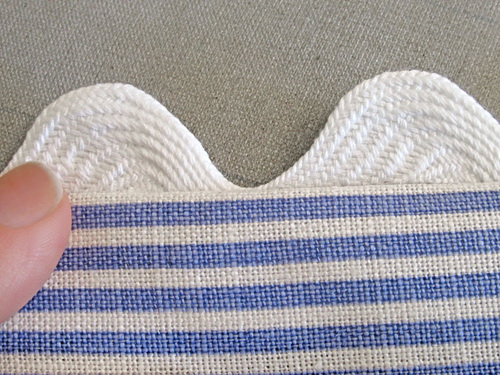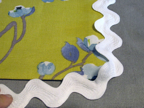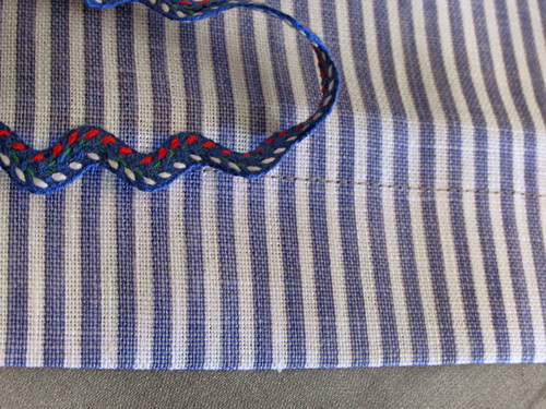 - If your piece to be trimmed with rick rack is self-contained, such as a pocket, you can also add the rick rack behind the finished edge rather than within the seam. This is a bit easier when you’re working with a curve or tight corners and/or if you’ve chosen a thinner trim. This is because you can see the rick rack at all times and can therefore insure your reveal is perfect – something that is a harder to do when the rick rack is hidden between layers.