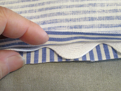 - If you are starting your trim in the center of a base fabric, turn under the raw end, aligning the folded edge with your starting point. In the photo below, our starting point was the edge of a stripe.