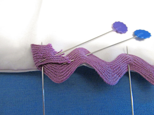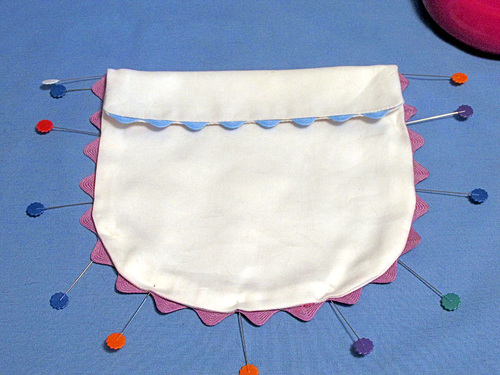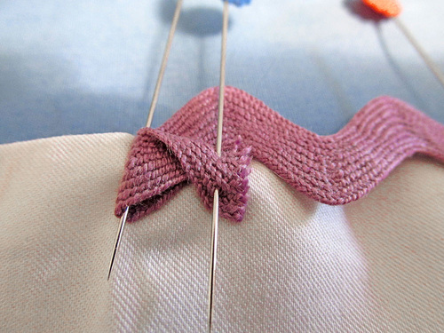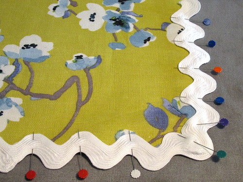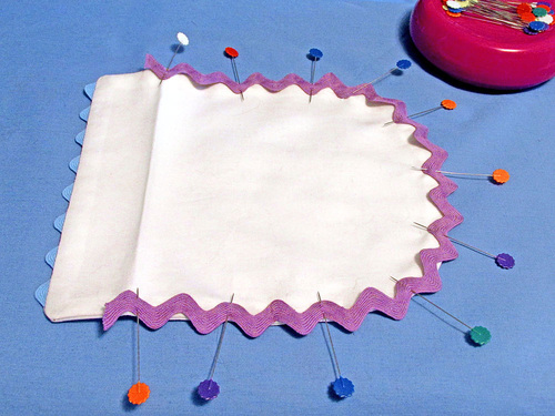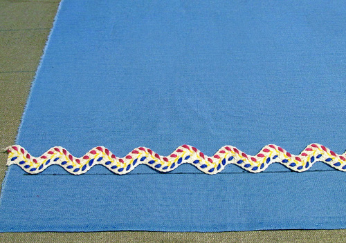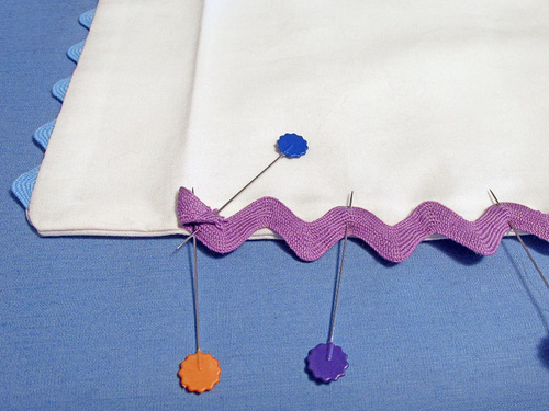 - Pin the rick rack in place so the bottom dip of the waves is flush with the raw edge of the fabric.