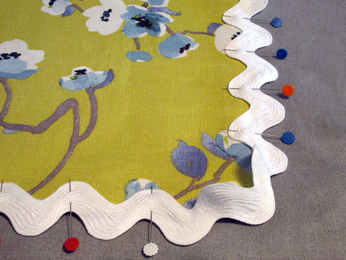 - Layer the second panel right sides together with the first and pin in place, sandwiching the rick rack between the layers.