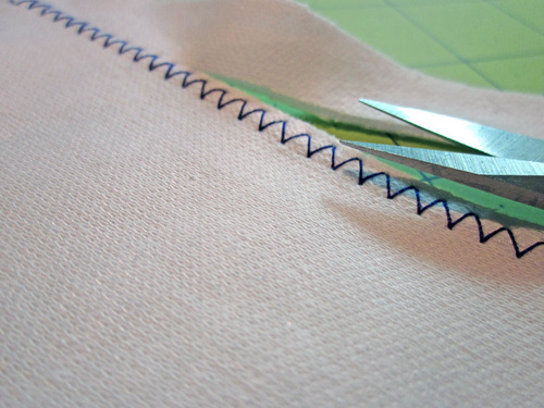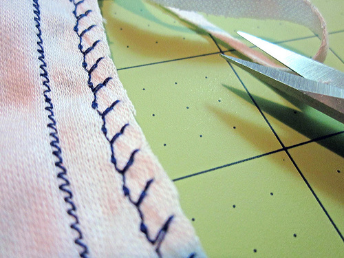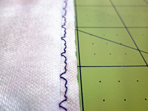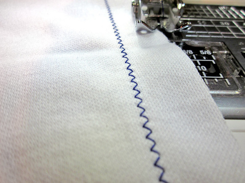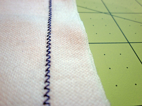 5. Some experts find using a wide (5.0+) zigzag stitch is better for knits. The idea is that you can create a similar effect as a serger with a stitch that is approximately ¼” wide, then simply trim away the excess beyond the stitching.