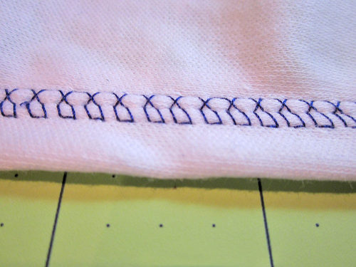 NOTE: As we mentioned above, in our stitching examples, we’re using an interlock knit. Once you have the proper needle and thread in place and have adjusted the pressure dial and tension (as needed for your particular knit)… stop. Grab a scrap and test, test, test the stitch you want to use before starting on your final project!