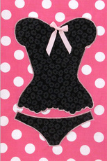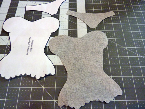 NOTE: Between the two pieces of the lingerie bag appliqué (the bustier and the undies), there should be approximately ¾” at the center (the widest point) and approximately ¼” at the sides (the narrowest points). Adjust as needed to make sure you have enough space to appliqué around all edges of both pieces and still leave an appropriate gap between the two pieces, as shown on our finished samples. If you are quite skilled with appliqué, you can get away with less space than if you are just learning. - Fuse each appliqué in place, following manufacturer’s instructions.