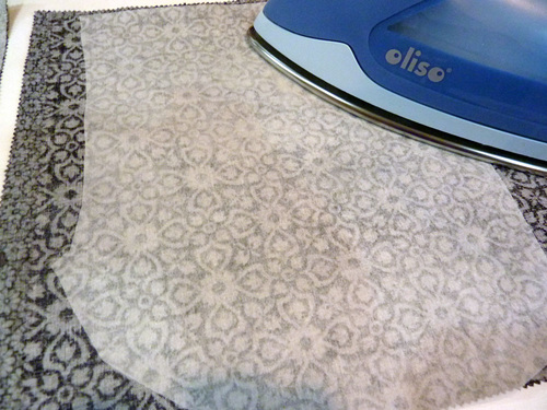 - Find the appliqué accent fabric. Following manufacturer’s instructions, fuse the paper backed appliqué adhesive to the wrong side of the accent fabric. Use a large enough piece to cover the size of the appliqué template, and position it behind were you plan to cut the appliqué.