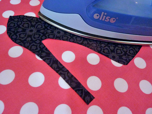 - Zig zag around all the edges of all the appliqué shapes, using the raw edge of the fabric as the center guide for your zig zag stitch. Go slowly and don’t be afraid to stop, with the needle in the down position, and re-adjust along the way in order to keep your stitching smooth and pretty. The scallops at the bottom the bustier will definitely require a bit of adjustment along the way.