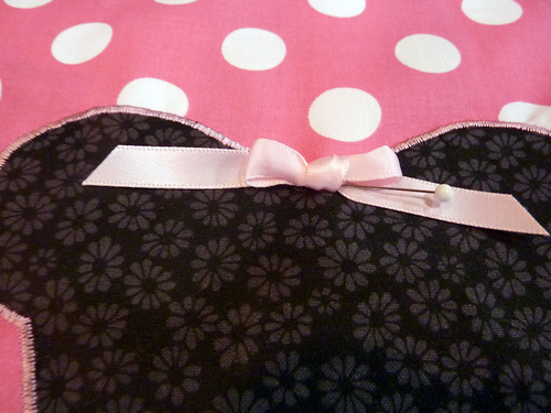 - Find the small length of decorative ribbon. Tie it into a tiny bow. Hand stitch the bow in place at the center of the bustier appliqué’s neckline.