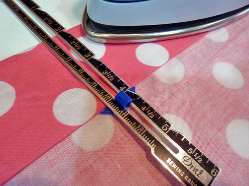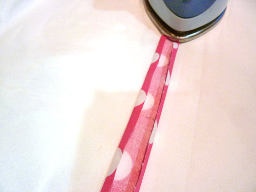 - Find the two 1¼” x 12½” strips for each bag (four strips total). Fold back each end ½” and press well. Fold back the long top and bottom edges ¼” and press well.