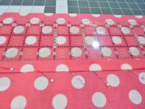 - Each casing should sit 4½” down from the top raw edge of the fabric rectangle and be centered side to side (¾” in from each side edge). Pin a casing strip in position on each fabric rectangle.