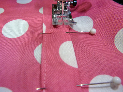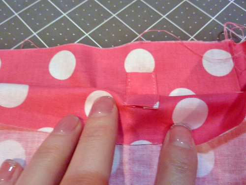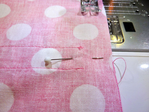 NOTE: Make sure your seam runs alongside but not across the ends of the casing strips. The casing strip should have been centered ¾” in from each raw edge. This means with a ½” seam allowance, you should have ¼” clearance, but still be careful – you don’t want to accidentally stitch the casing shut.