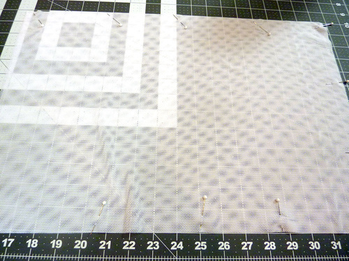 NOTE: Fussy cut the strips to match the main motif of your exterior fabric. These strips will become the front and back casings and should be placed to blend into the main fabric to be as invisible as possible. Measure 4½” down from the top raw edge of the fabric rectangles. This is the area that will be covered by the cashing strip, so it is the part of the motif you want to match for the casing strip fussy cuts. For our samples, we centered a row of dots within our casing strips. - From the mesh, cut the TWO 13″ x 19″ rectangles.