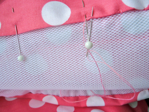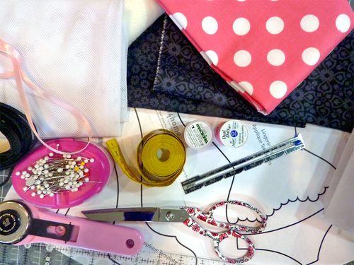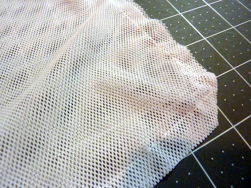- ½ yard of 44″+ wide soft, polyester mesh in a light color to coordinate with the main print fabric; we originally used an athletic style micro mesh in white