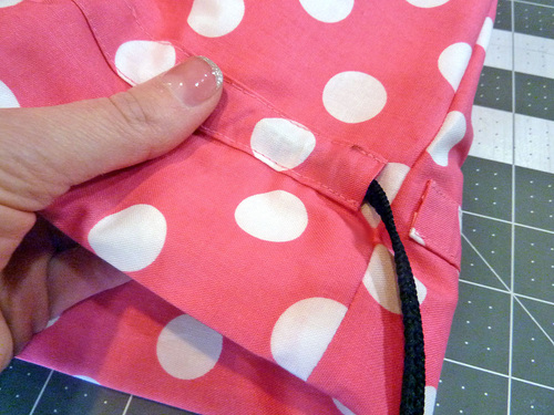 - Edgestitch along the top and bottom of each casing strip. Leave the ends open. In order for the cording to easily slide through the casing, it’s important your stitching line be straight and very close to the folded edge – ⅛” or less.