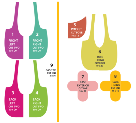 The illustrations below show all the tote and case pieces and their cut sizing. Our yardages are based on the Fruit for Thought sample, but by referencing the size of each of the pieces, you can determine the yardage changes necessary should you wish to include fewer fabrics, more fabrics, and/or more fussing cutting in you own totes and case. Don’t forget, our yardage and cut numbers are based on TWO matching totes and ONE case.