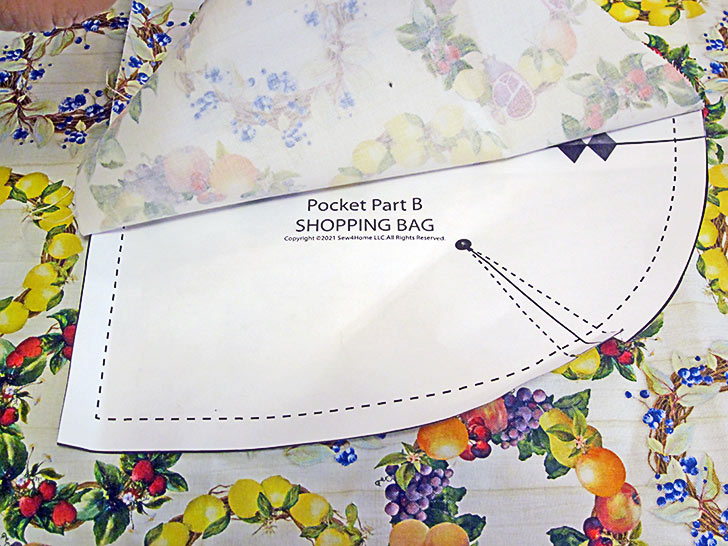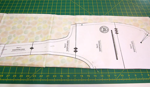 - The two additional pocket pieces are the pocket lining panels and do not have to be fussy cut since they are inside the pocket. Instead, simply use the assembled pocket pattern to cut the two lining pieces. BUT – you must cut these lining pieces with the paper pattern facing right side down (printed side down) so when you are ready to place the lining pieces right sides together with your fussy-cut exterior pieces, all the edges line up properly. Otherwise you’ll end up with “two left feet.”