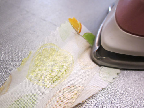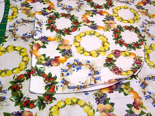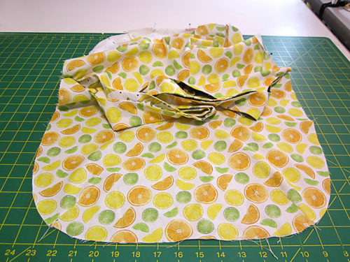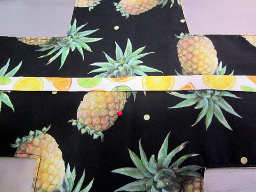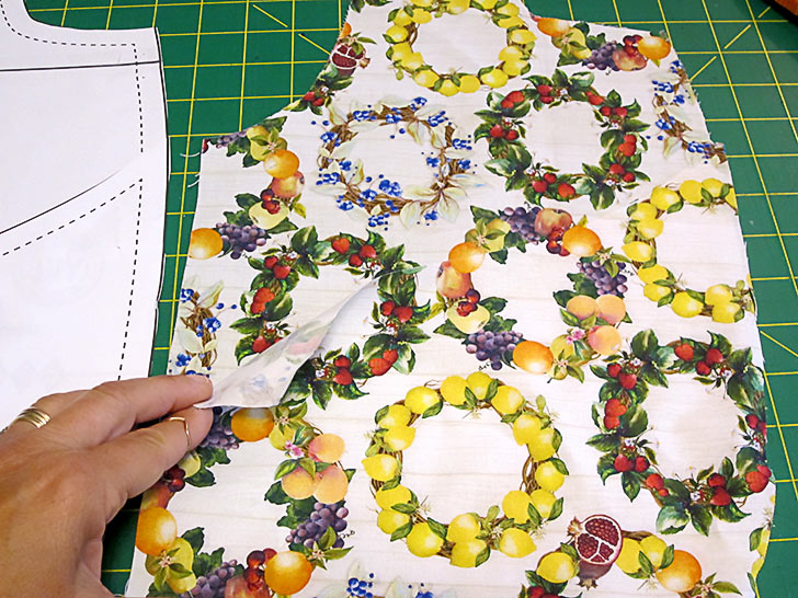 NOTE: As mentioned, this was a directional print in our chosen collection, so we carefully cut to make sure the stripes were running horizontally across the pattern piece and that a large stripe was centered within the panel. - From Fabric E (Citrus Slices in our sample), prepare and cut the following: