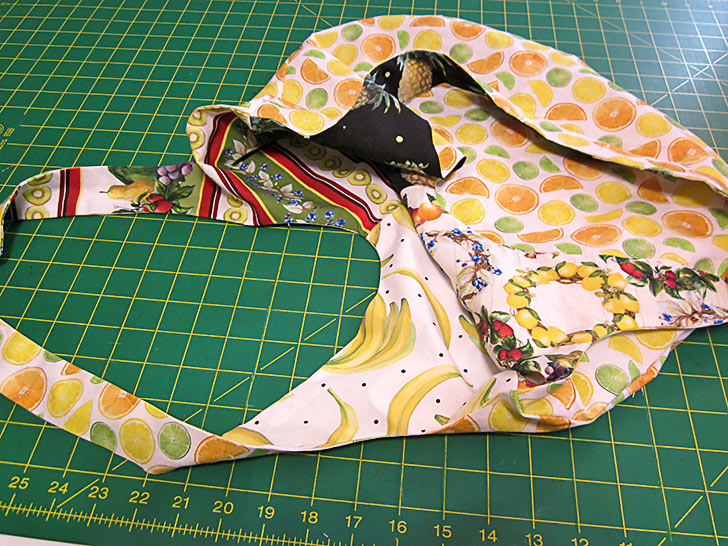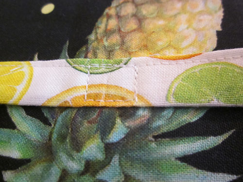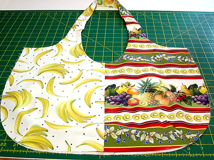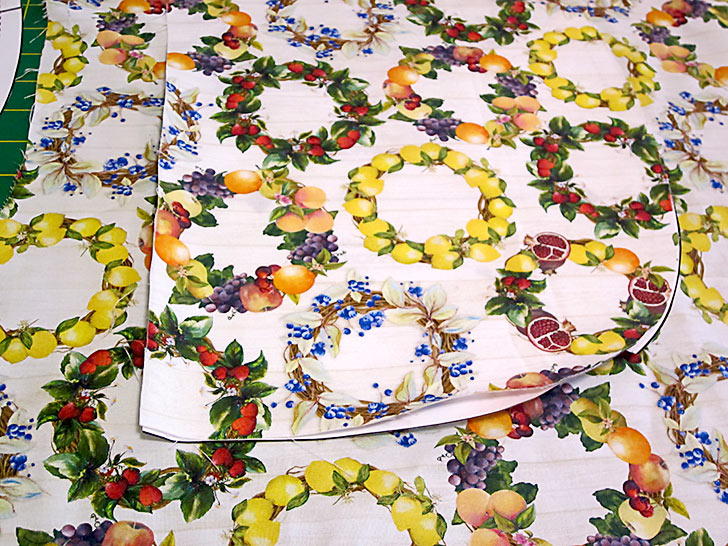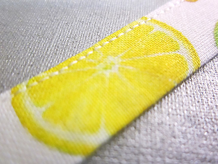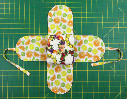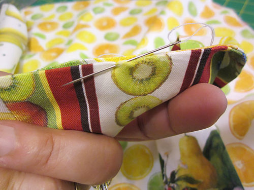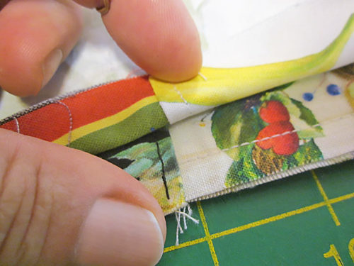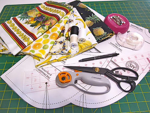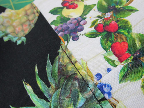 For the most part, the fabrics we chose had random motifs, making it easy to place and cut all the pieces. However, on this Fruit for Thought sample, we did use one directional print – a stripe. In addition, we pattern-matched the front pocket to its background panel. Both of these situations require precision cutting and a bit more fabric. We’ve accounted for these situations in the yardage recommendations below, and we provide links to our full tutorials on both fussy cutting as well as pocket-to-panel matching.