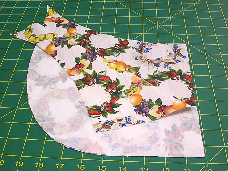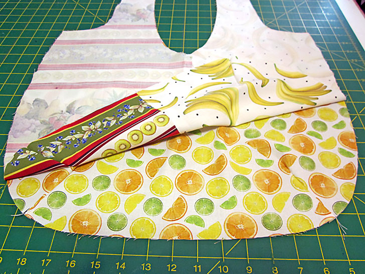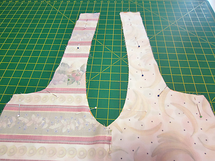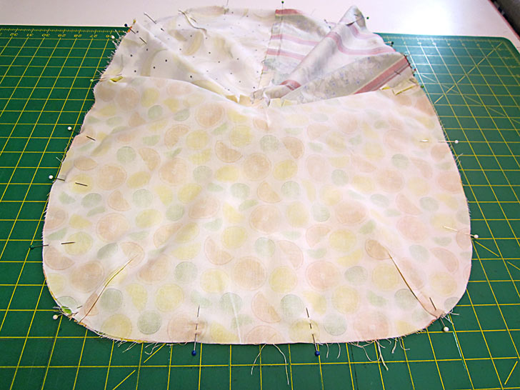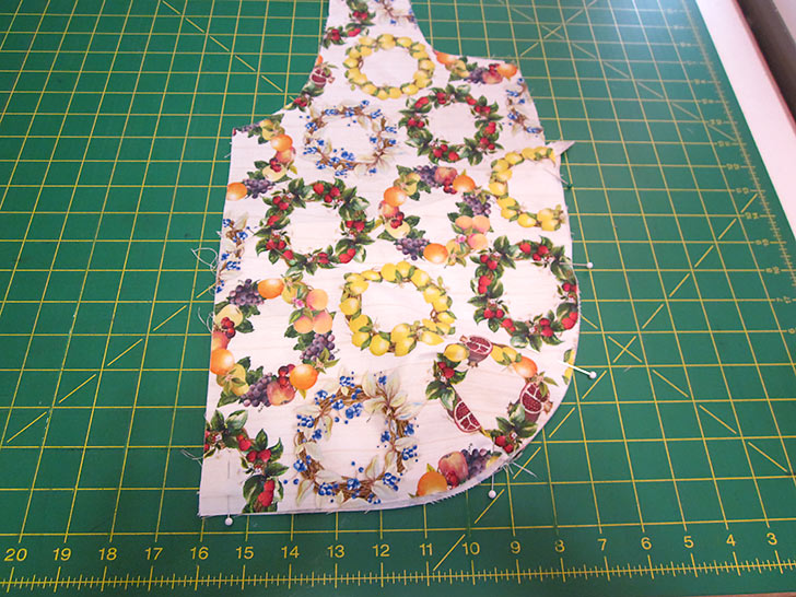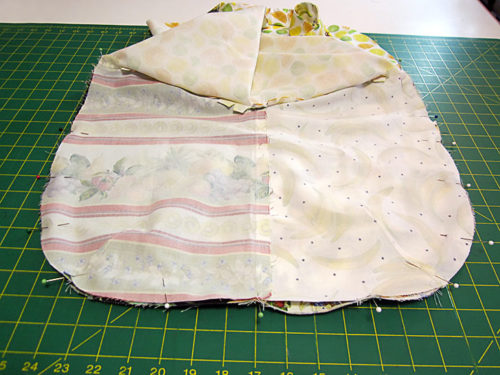 - Place the pocket right side up on top of the main panel. The bottom curves should be flush and the darts should be aligned. If you fussy cut, the pocket should also be a perfect match to the background panel.