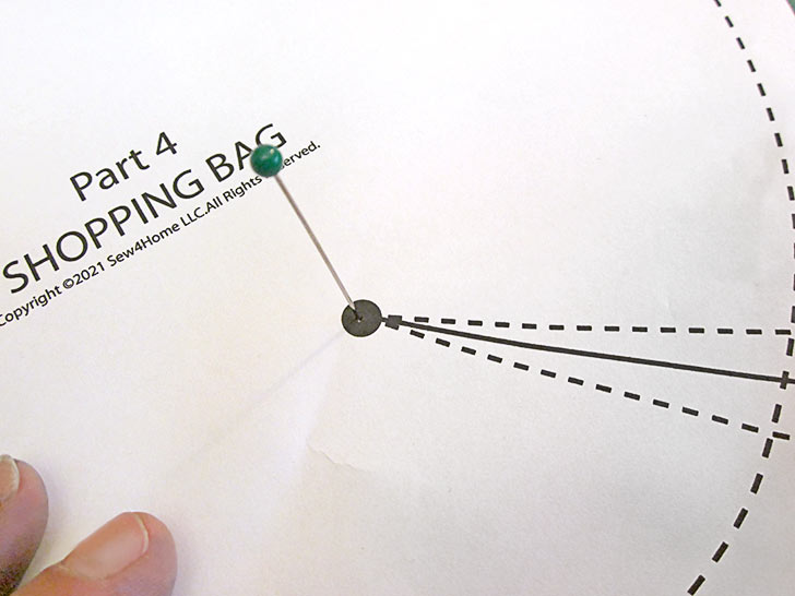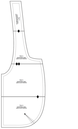 - Before you set aside all your assembled paper patterns, you need to mark the position for the bottom darts. There is a dart at the bottom of each half section, each pocket, and at the bottom left and right of the front and back lining panels. This means each tote has nine darts. You’ll get lots of practice!