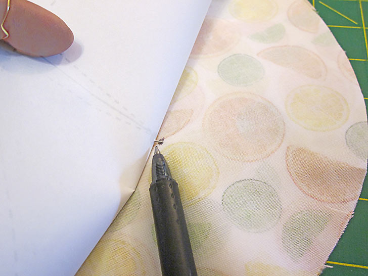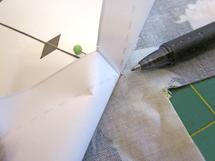 - Gently lift up the paper and transfer the pin point to the fabric with your fabric pen or pencil.