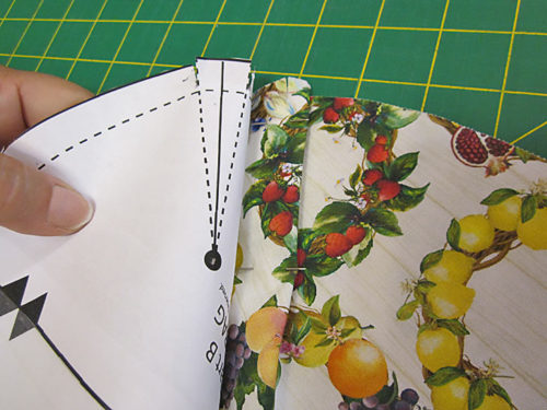 - Place the assembled pocket pattern underneath the background panel you just cut (piece 2), aligning the bottom curved edge of the fabric with the bottom curved edge of the paper pattern.