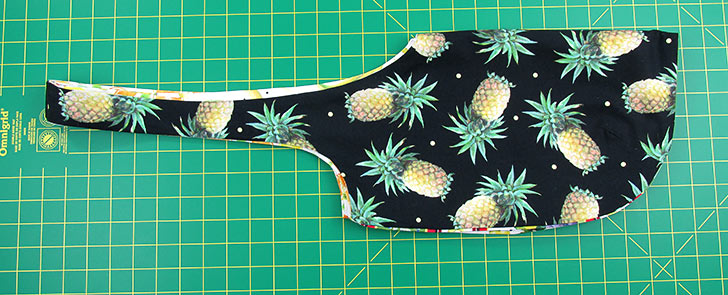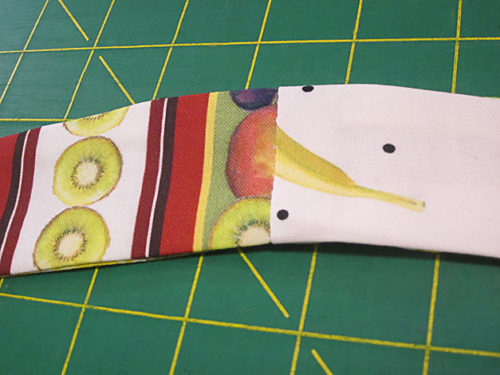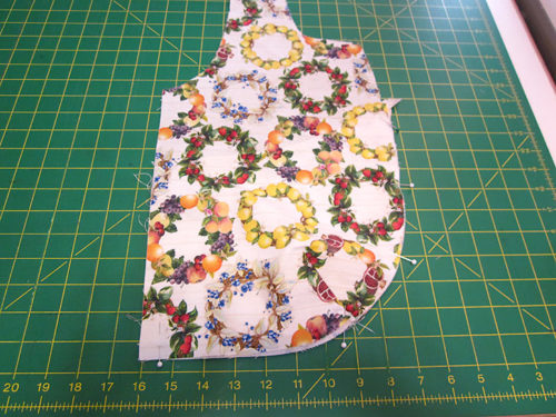 - From Fabric D (Fruit Stripes in our sample), using the assembled half body pattern, cut TWO for the back right sections (piece 4).