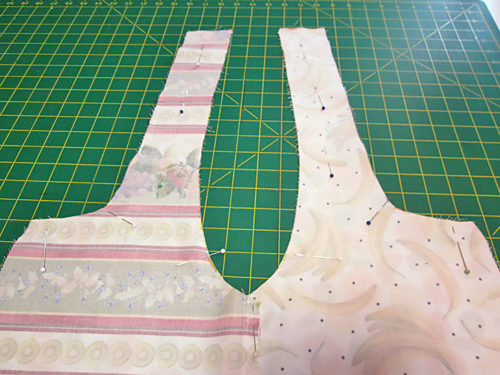 - Place the assembled front panel right side down on one lining panel and the assembled back panel right side down on the other lining panel. Make sure the darts line up on both panel pairs.