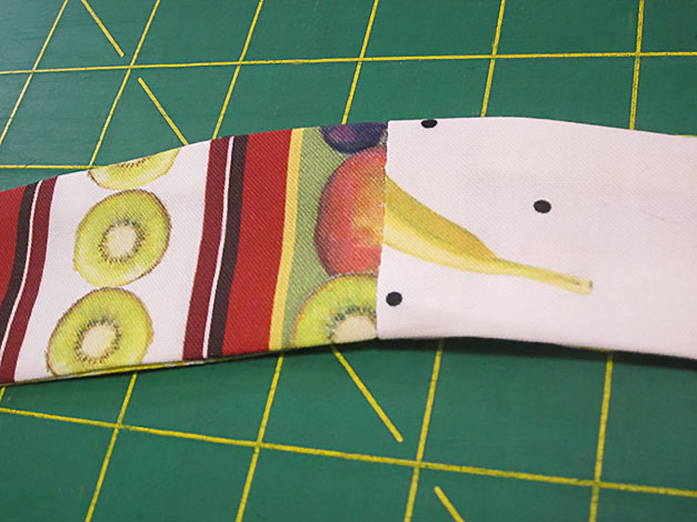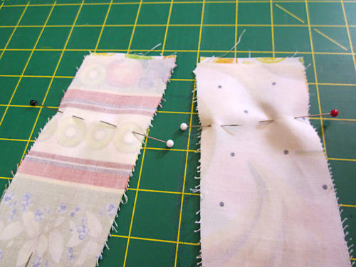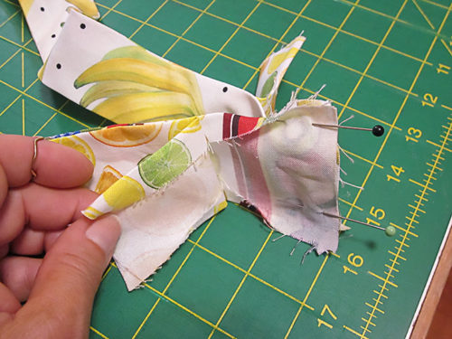 - When pinning, mark a stopping point 2” down from the top raw end of each strap. This mark cues you when to stop your seam. You can mark a horizontal line with a fabric pen or pencil, use double pins as an “alert mark,” or simply stop your pins at this 2” point.