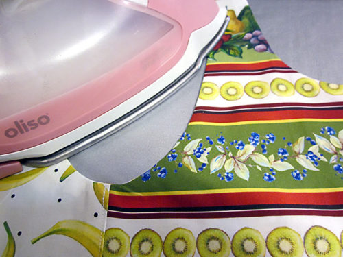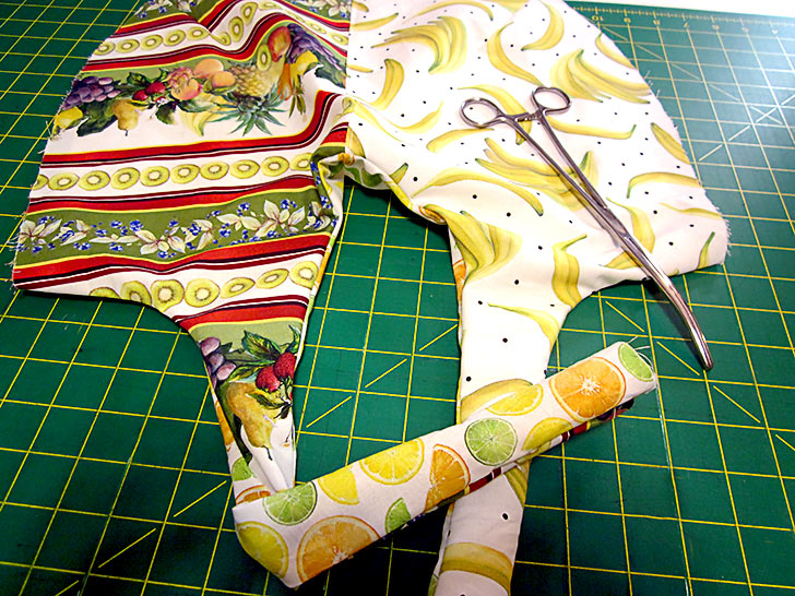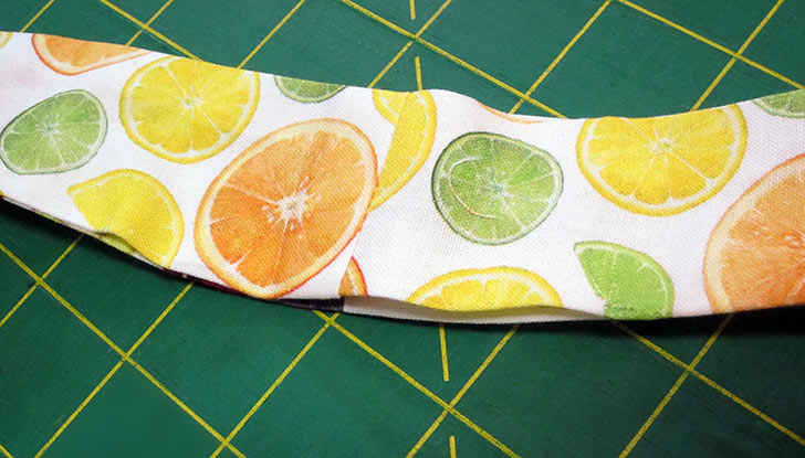 NOTE: As shown in the photo above, if you have a pair of hemostats, this can make turning the straps easier. We have a full tutorial on turning skinny ties and straps with this method. - Press the layers flat, being careful to make sure the sewn seams are straight and even along the curves. Press all the way to the open ends of the straps, pressing in the raw edges so they are flush with the sewn seam.