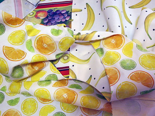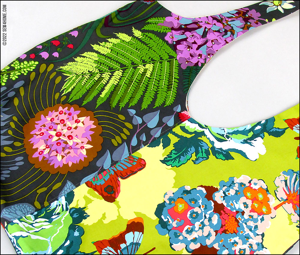 Our custom tote design uses up to SIX coordinated prints. For our featured sample, we used FIVE prints from the Fruit for Thought collection by D. DonFrancisco. Our other three sample totes (shown in the beauty images above as well as the companion article), each feature SIX fabrics, the sixth fabric being a contrasting pocket rather than a fussy cut, matching pocket.