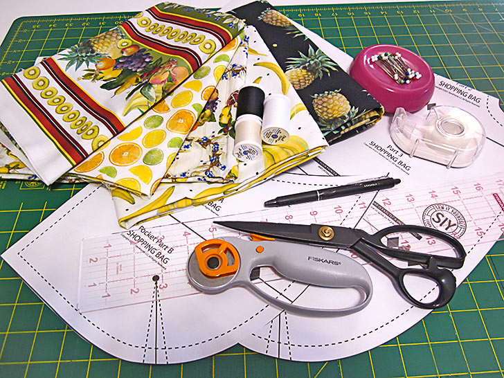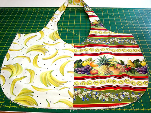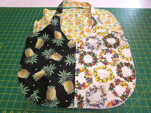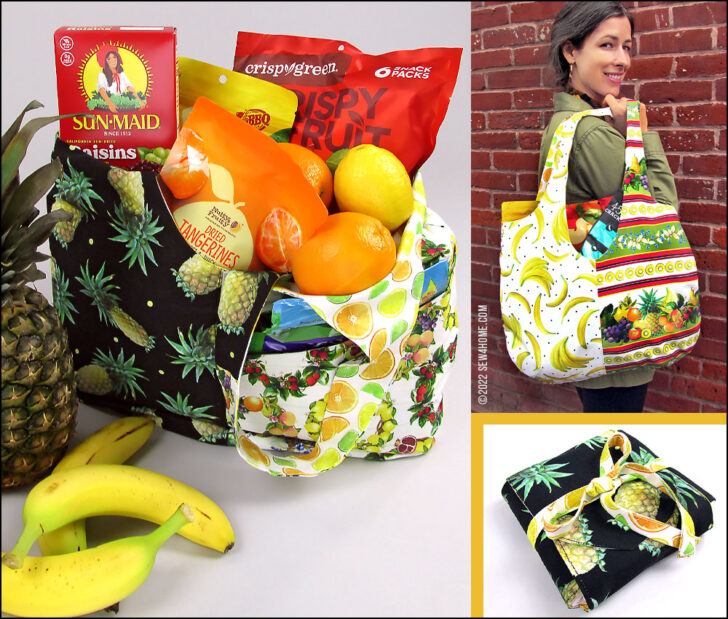 Our original main sample tote above originally used five happy prints from the Fruit for Thought collection by Dianna DonFrancisco for The Blank Quilting Corp. and includes a perfectly matched, fussy cut pocket on the front panel. And yes, we do have the extra steps – as well as a link to a full tutorial – to show you how to get that perfect match of a pocket to a background panel.