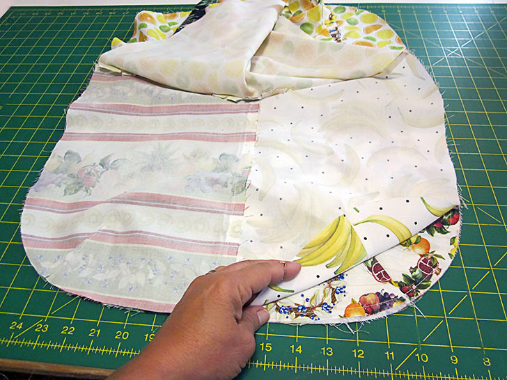- Turn the pocket right side out so the two panels are now wrong sides together and the curved seam is running right along the top.