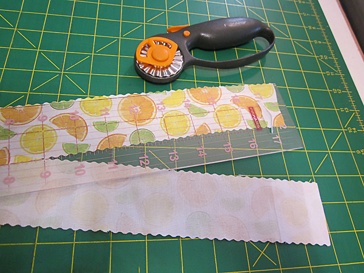 - Find the 2” x 36” tie strip. As you can see in the photo below, we cut our strip using the pinking blade on our rotary cutter. This is optional, but does help to keep thin strips like this from fraying while you are working with them.