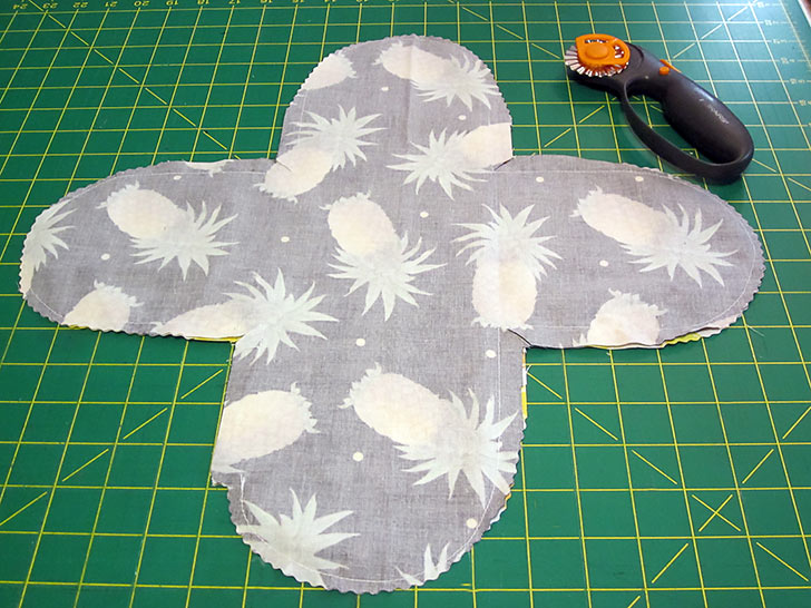 NOTE: For more information on the best practices for cutting and stitching corners, take a look at our full tutorial. - Trim back the seam allowance around each of the curved ends of the “wings” to about ¼”. You can see we again used the pinking blade on our rotary cutter. A standard straight cut would also work. In the photo below, you can also see the start and stop points of our seam and the opening left for turning in the lower left of the case.