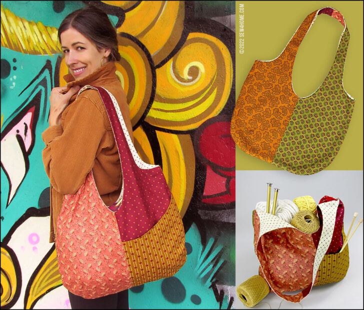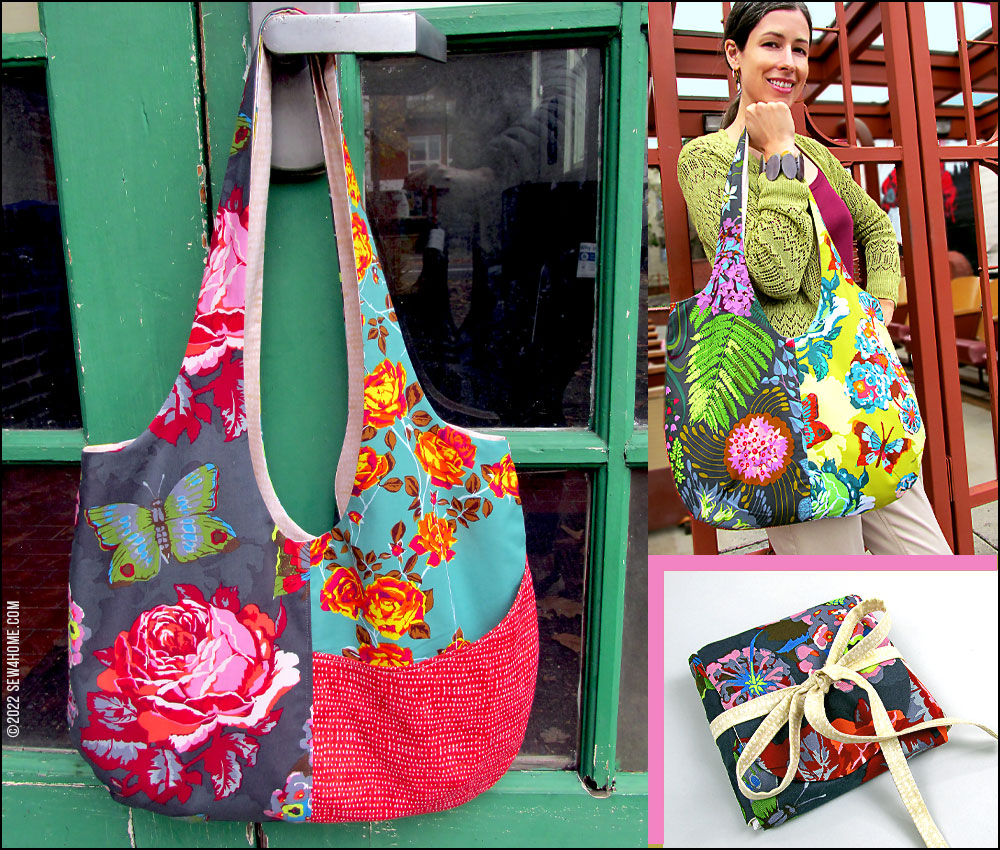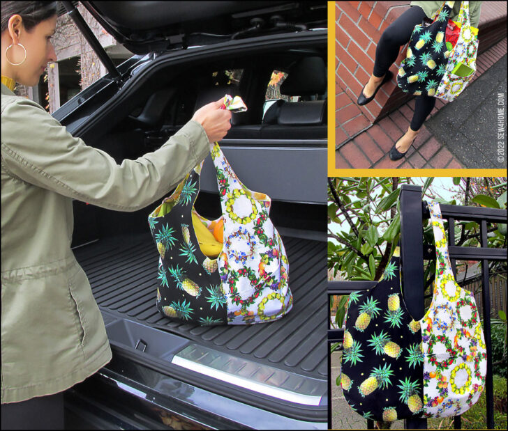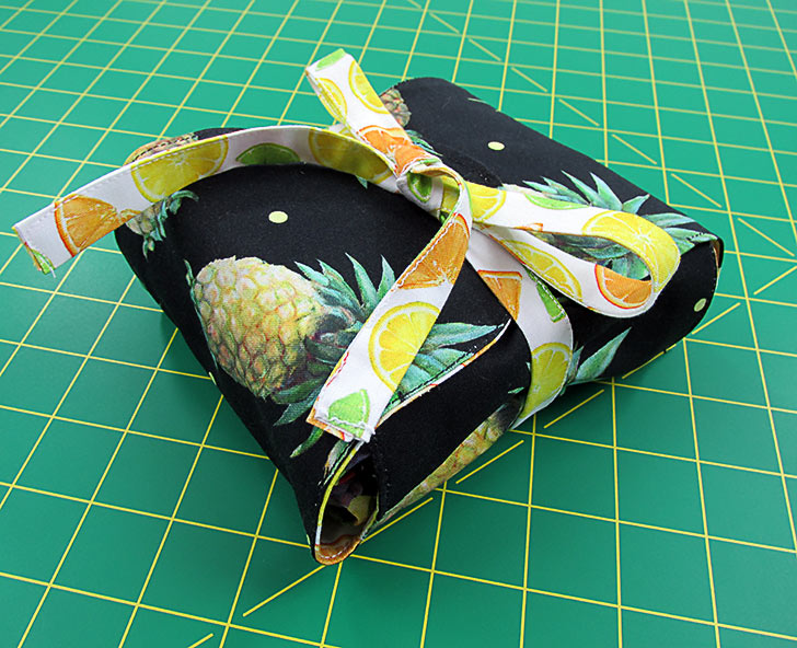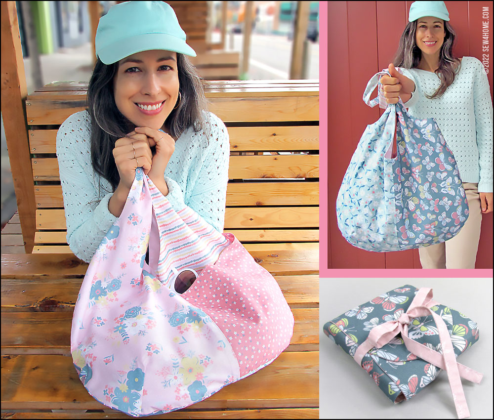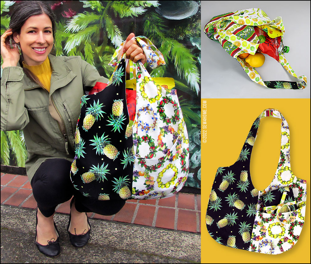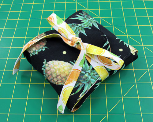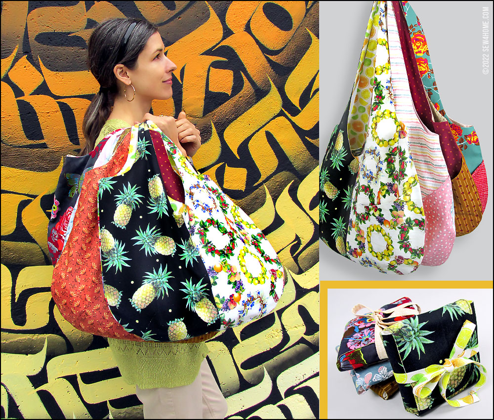 With two strong layers of quilting cotton, there’s no need for interfacing, so you can easily fold down two bags to fit into the matching case. Just fold, roll, wrap, and tie. It makes a perfect, compact case to store in your purse or glovebox or toss into another tote.