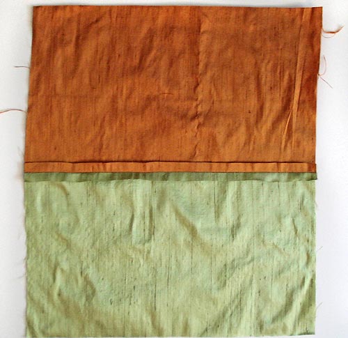 NOTE: If using silk dupioni, before cutting, make sure the ‘slubs’ (those kind of bumpy lines) in the silk are running parallel to the height of the shapes, ie. vertically . - From the fabric for the upper right front block (Iridescent Bittersweet in our sample), cut ONE block 10″ high x 16½” wide.