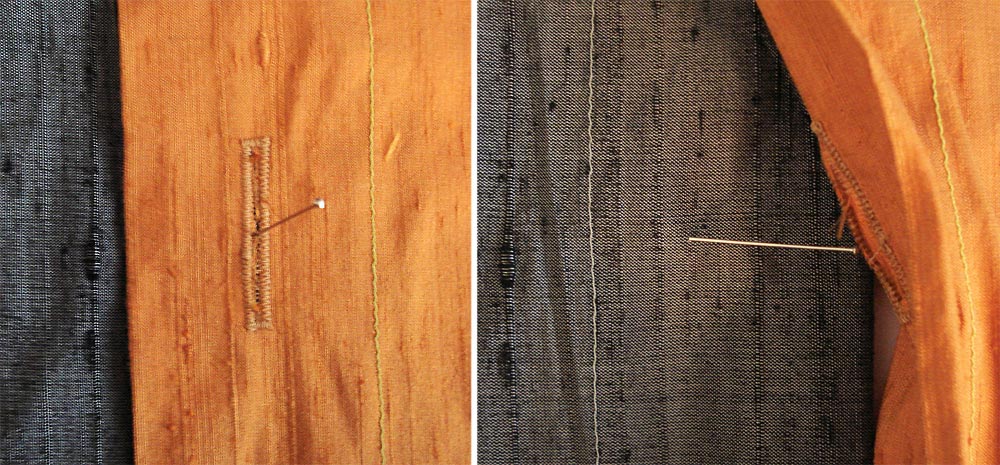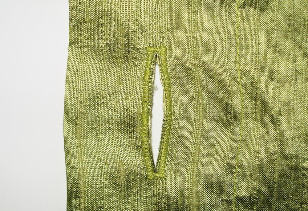 - Use your sewing machine to make a vertical buttonhole at each of the four marked points, centering the buttonhole between the folded hem edge and the hem topstitching. Use the top and bottom pins as a guide for the correct length.