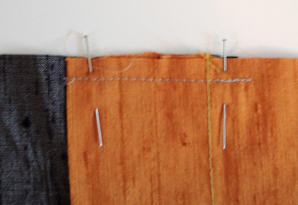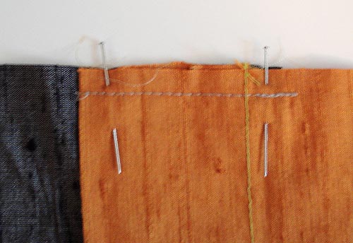 - Pin the panels together at the top and bottom edges, and sew a short seam approximately ¼” from the raw edge. This is called a line of ‘stay stitching.’ With the two panels “locked” together like this, you can now work with them as one piece… much easier for the final steps.