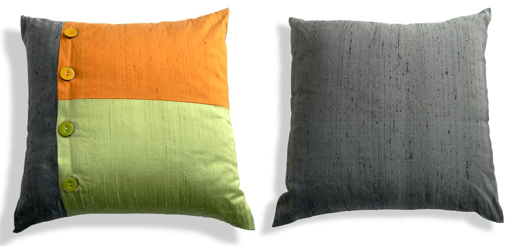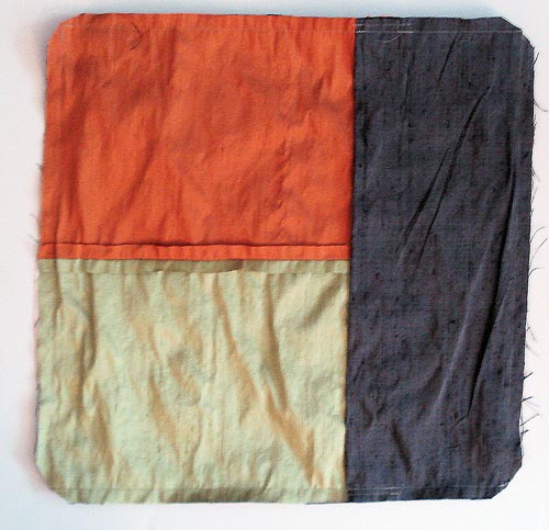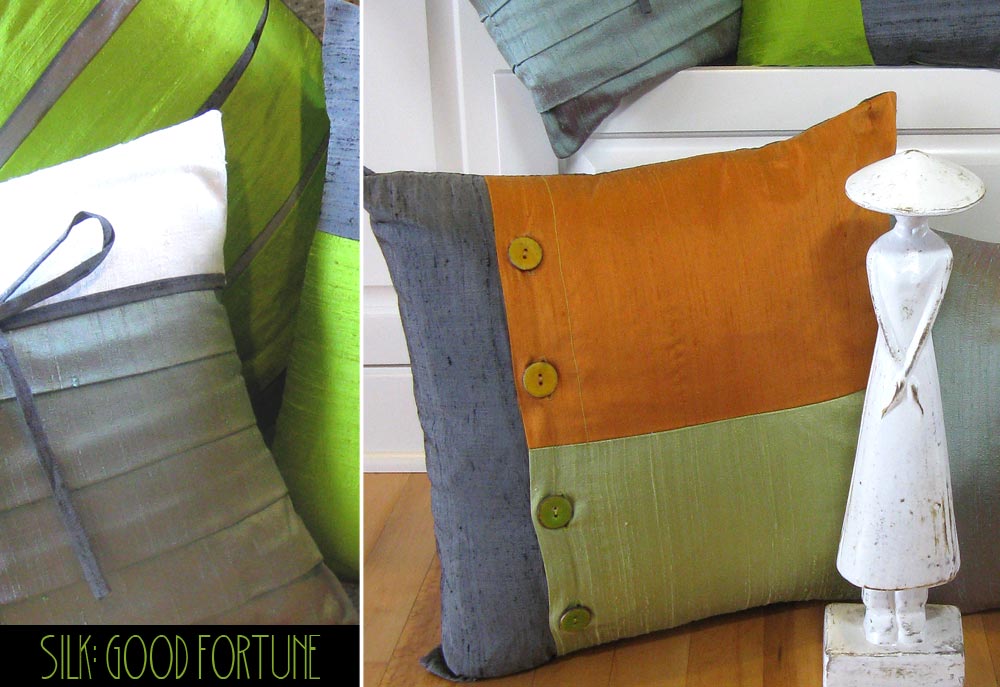 We created a set of beautiful silk color block pillows, each one guaranteed to bring you good luck and long life… or at least to be fun and easy to make. This is the Good Fortune pillow, which features a balanced trio of color blocks with a button-front closure. Breaking a square into three varied sections is pleasing to the eye; our four equal buttons then add a measure of even symmetry to the odd number of blocks. Here is your Chinese proverb for the day: A bit of fragrance clings to the hand that gives flowers.