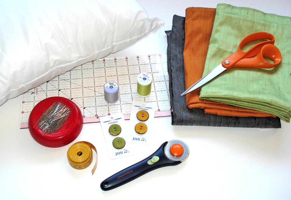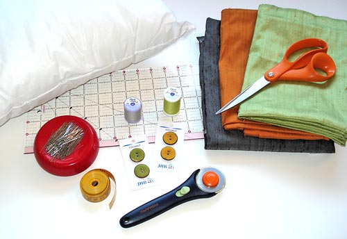 - Four 1″ buttons for the front closure: we used 2 in orange and 2 in green to match the silk dupioni colors