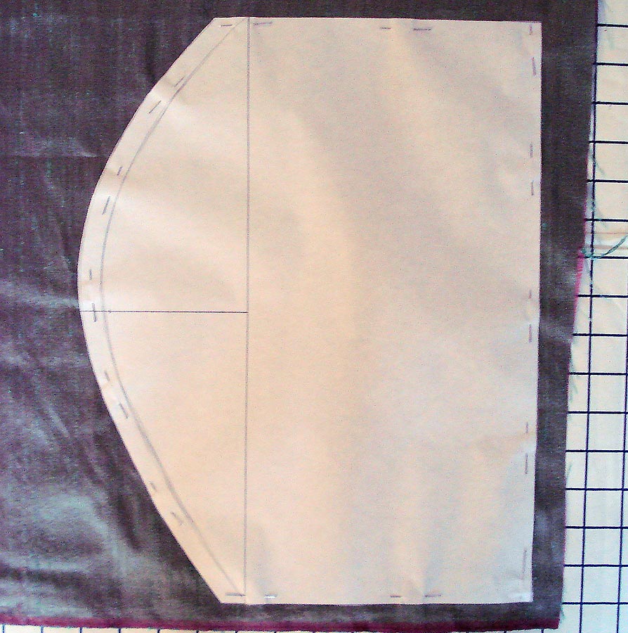 - Lay paper template on the lighter fabric you are using for the Right Front Curved Panel (Iridescent Berry Jade in our sample). As with your other cuts, if you are using dupioni, the slubs should be running vertically.
