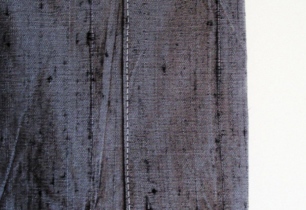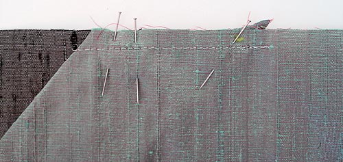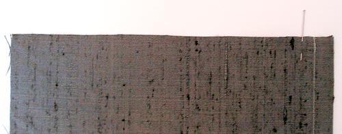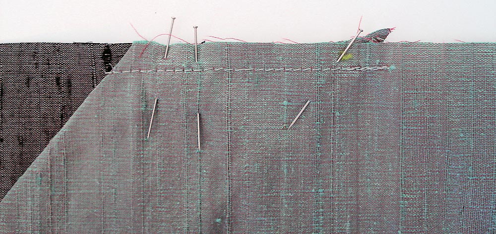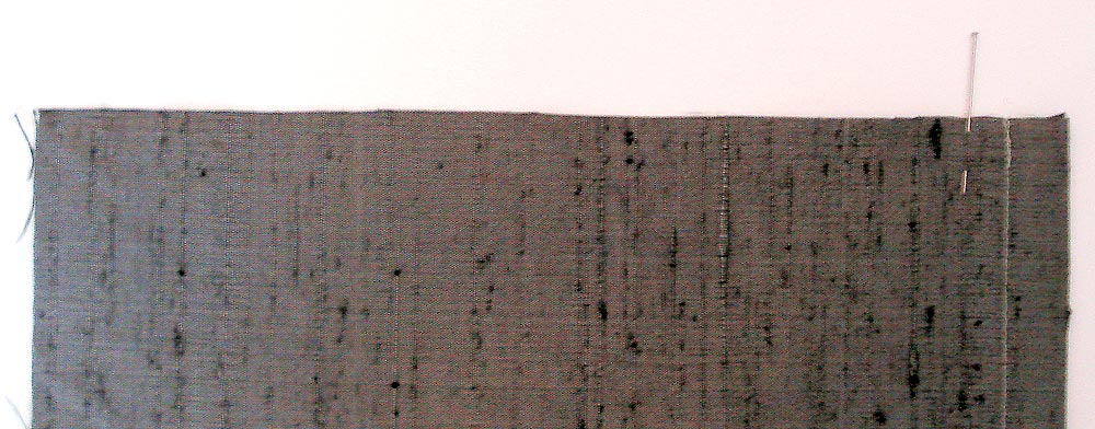 - Pin these panels together at the top and bottom, including the width of the facing, and sew a short horizontal seam approximately ¼” from the raw edge. This is called a line of ‘staystitching’. With the two panels ‘locked’ together like this, you can now work with them as one piece… much easier for the final steps.