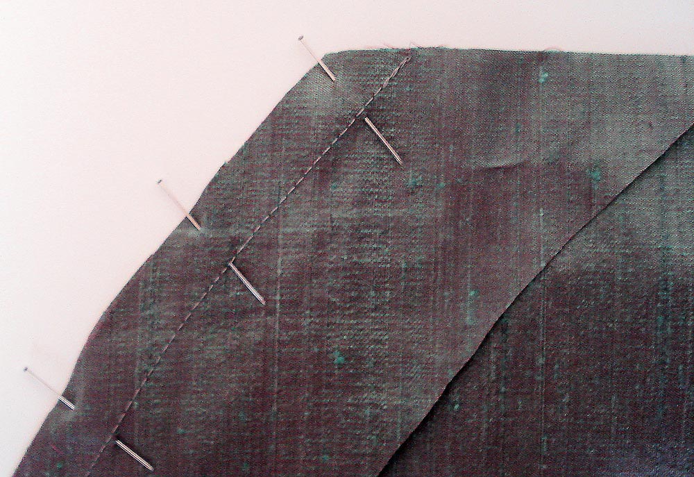 - With right sides together, pin the outer curved edge of the Curved Facing to the curved edge of the Right Front Panel.