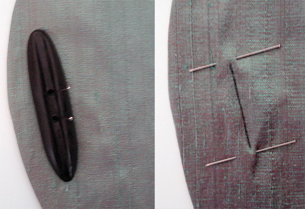 - Mark the placement for the buttonhole on the Right Front Curved Panel based on your original paper template. In our sample, we first marked the two holes in the button with pins. Then, we measured up ¾” and down ¾” from these pins, and drew a straight line connecting them to indicate the length and angle of the buttonhole.
