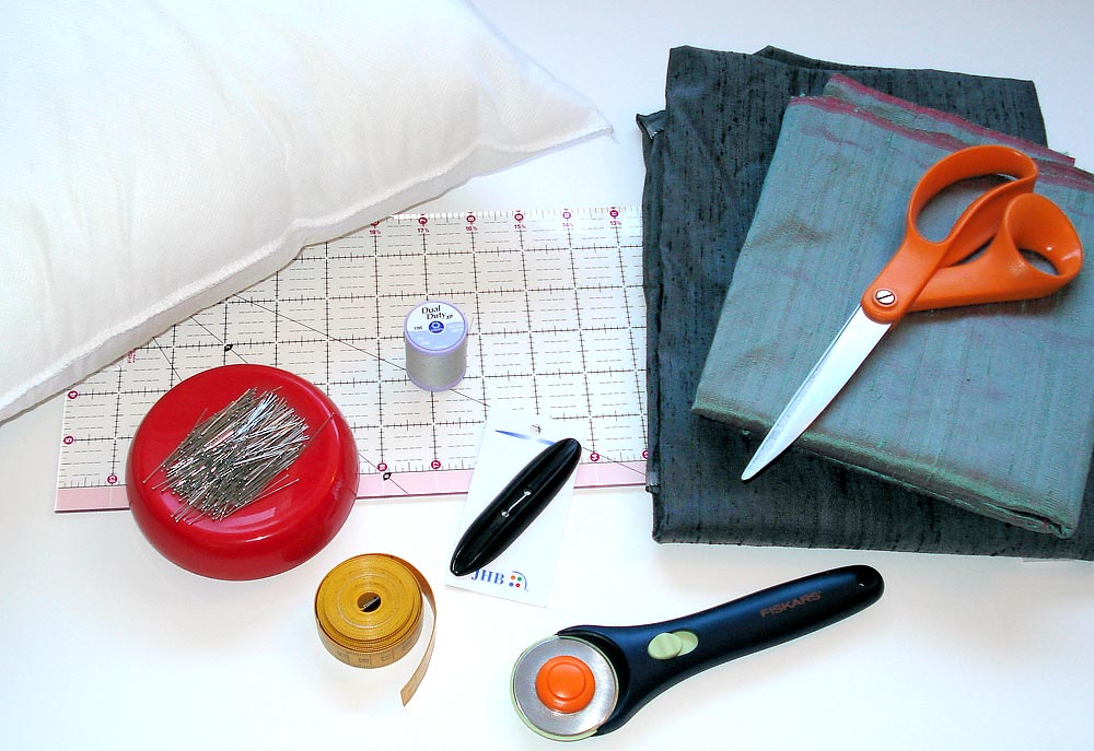 - ½ yard of 44-45″ wide fabric for the left front of the pillow: we used silk dupioni in Iridescent Platinum from Fabric.com