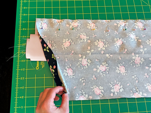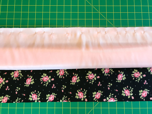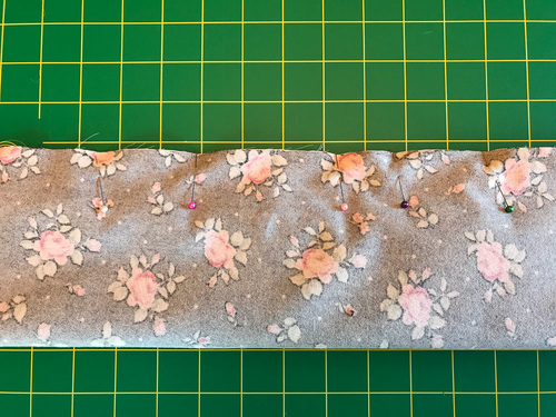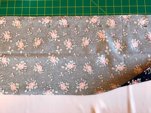 - Unfold the cuff and place it right sides together along the top edge. Remember, if using a directional print, you are pinning the bottom edge of the cuff against the top edge of the pillowcase body, aligning the 41” raw edges.