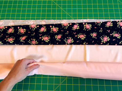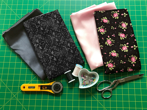 NOTE: With the solid satin, there is no directional motif to worry about, so you can cut horizontally for the most efficient use of the wide Silky Satin (58/60”). You will use the full 27” of a ¾ yard cut, so if worried about your accuracy, consider getting a full yard. If working with a directional print, a full yard is also recommended. - ⅓ yard of 44″+ wide cotton flannel for the pillowcase cuff; we originally used Roses in Black and Filigree in Black, both from the Welcome Home flannel collection by Jennifer Bosworth for Maywood Studio
