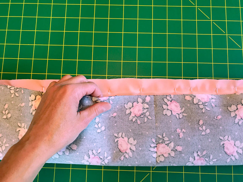 - Starting at the bottom edge of the pillowcase body, begin rolling the body up towards the cuff at the top of the pillowcase. Keep the roll fairly tight, about 3″ in diameter; it needs to fit within the cuff.