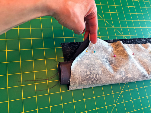 - The cuff is now right sides together, its top raw edges are aligned, and the fabric roll is between the layers of the cuff… like the filling of a burrito! Pin along the top raw edges.