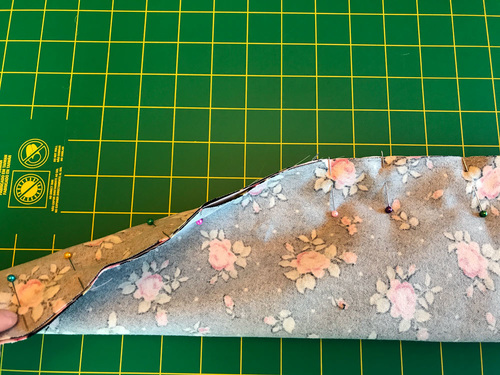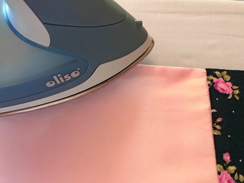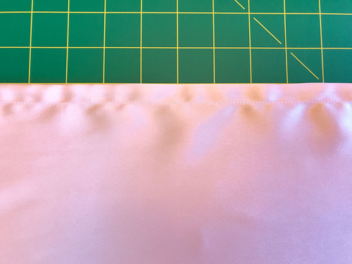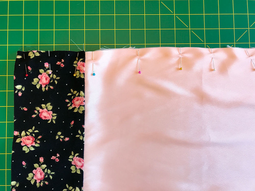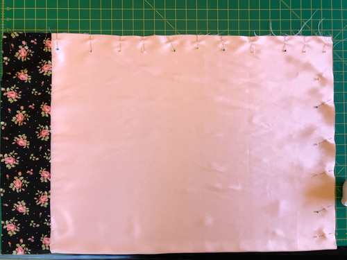 - The pillowcase is finished with a French Seam. To do this, fold the case in half WRONG sides together (yes… right sides out). Pin along the side and across the bottom. The satin is indeed silky; use plenty of pins to help keep the layers from shifting.